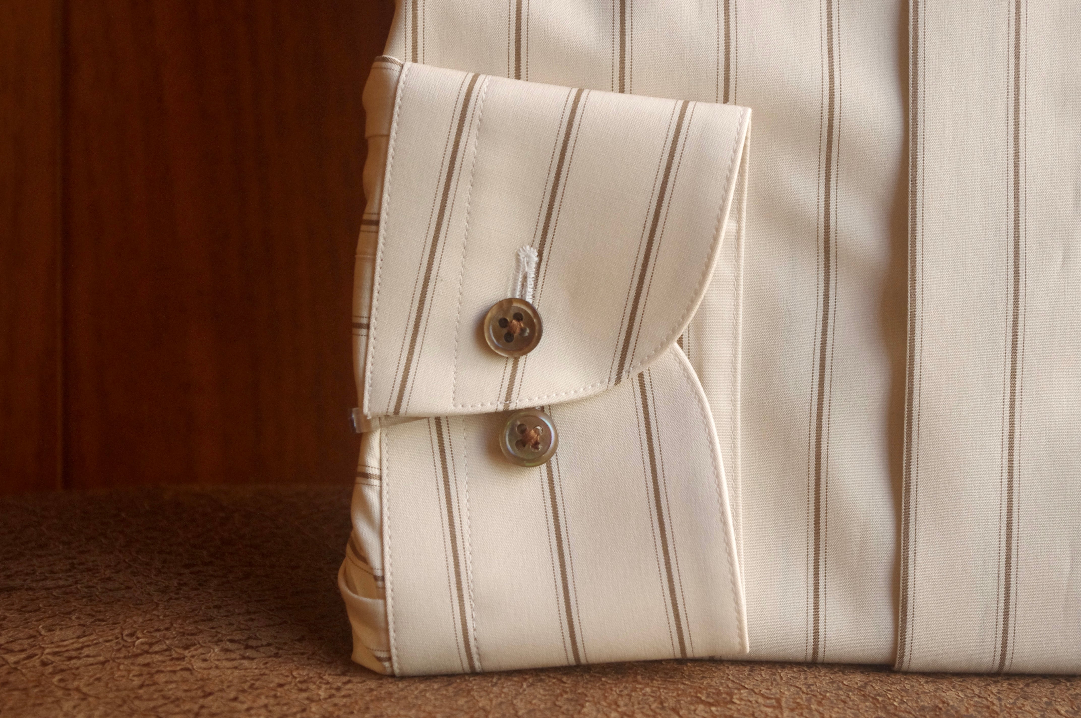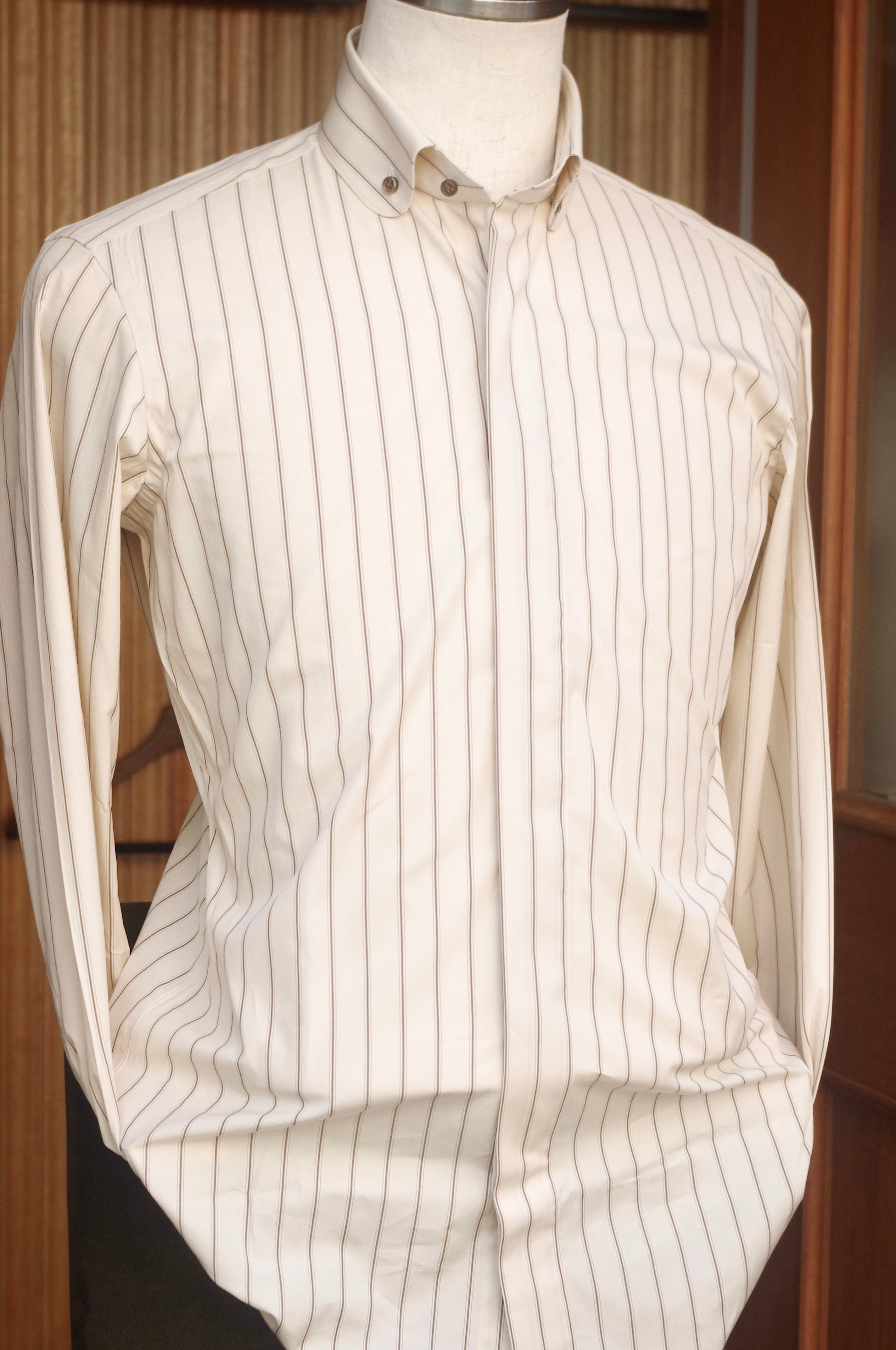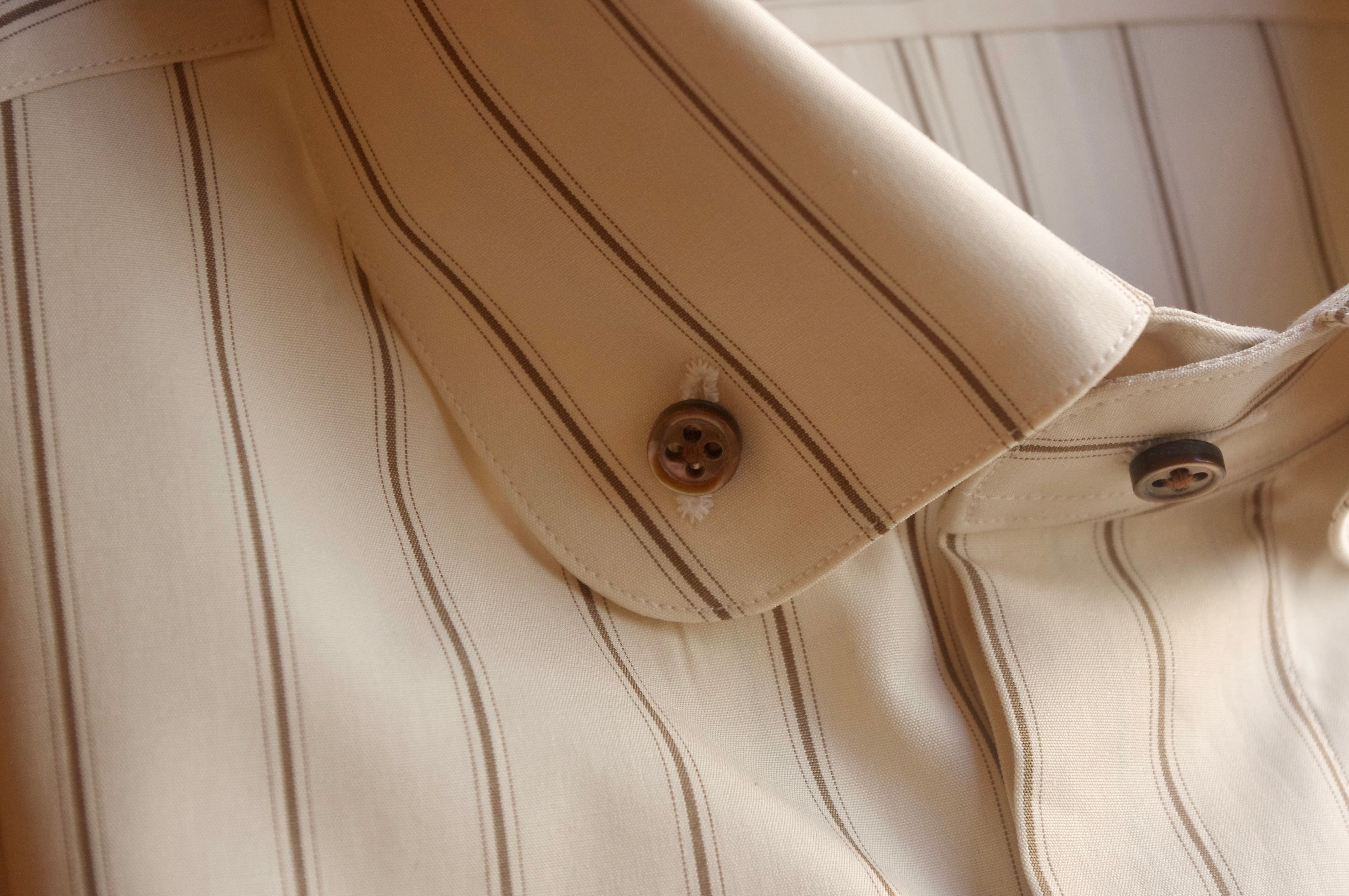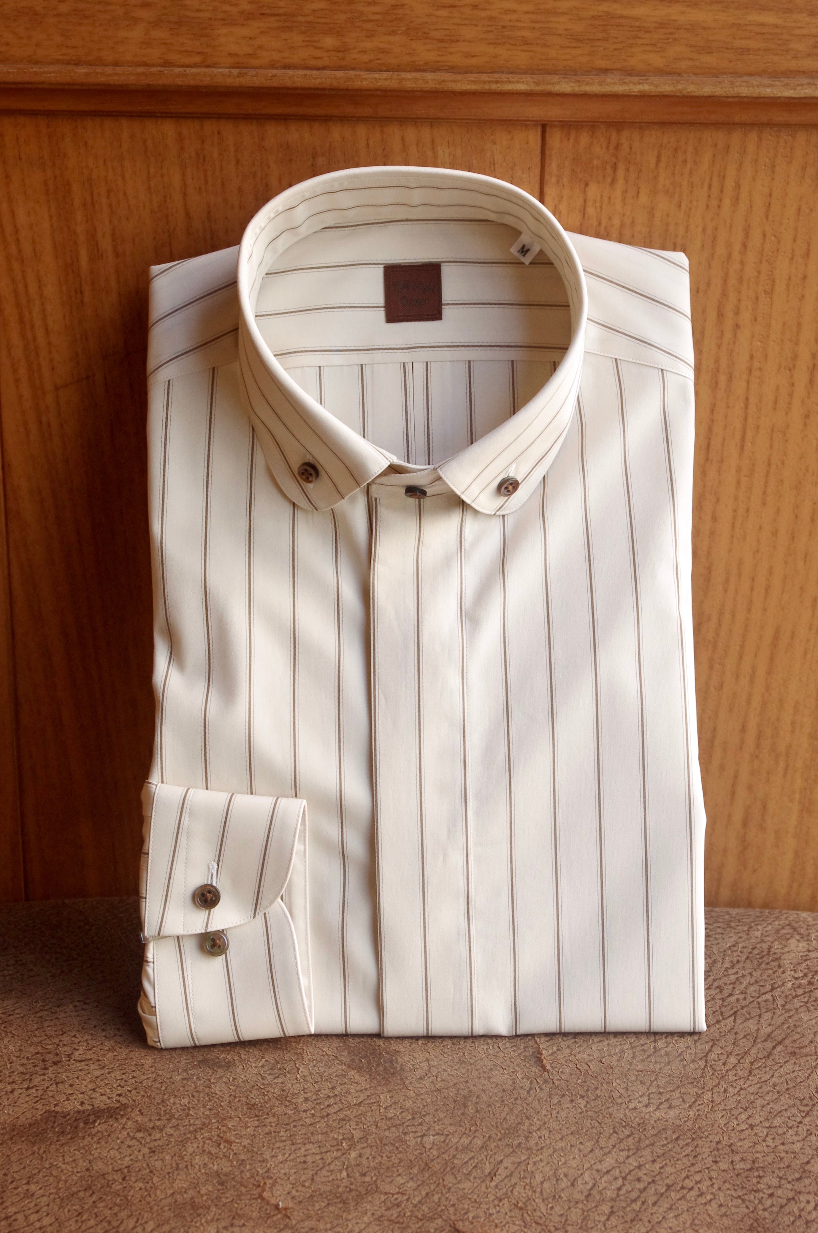 色合いはベージュとブラウンのアースカラーでレトロな雰囲気の生地で、ノーネクタイでの着用以外に、蝶ネクタイやネクタイもご使用可能です。