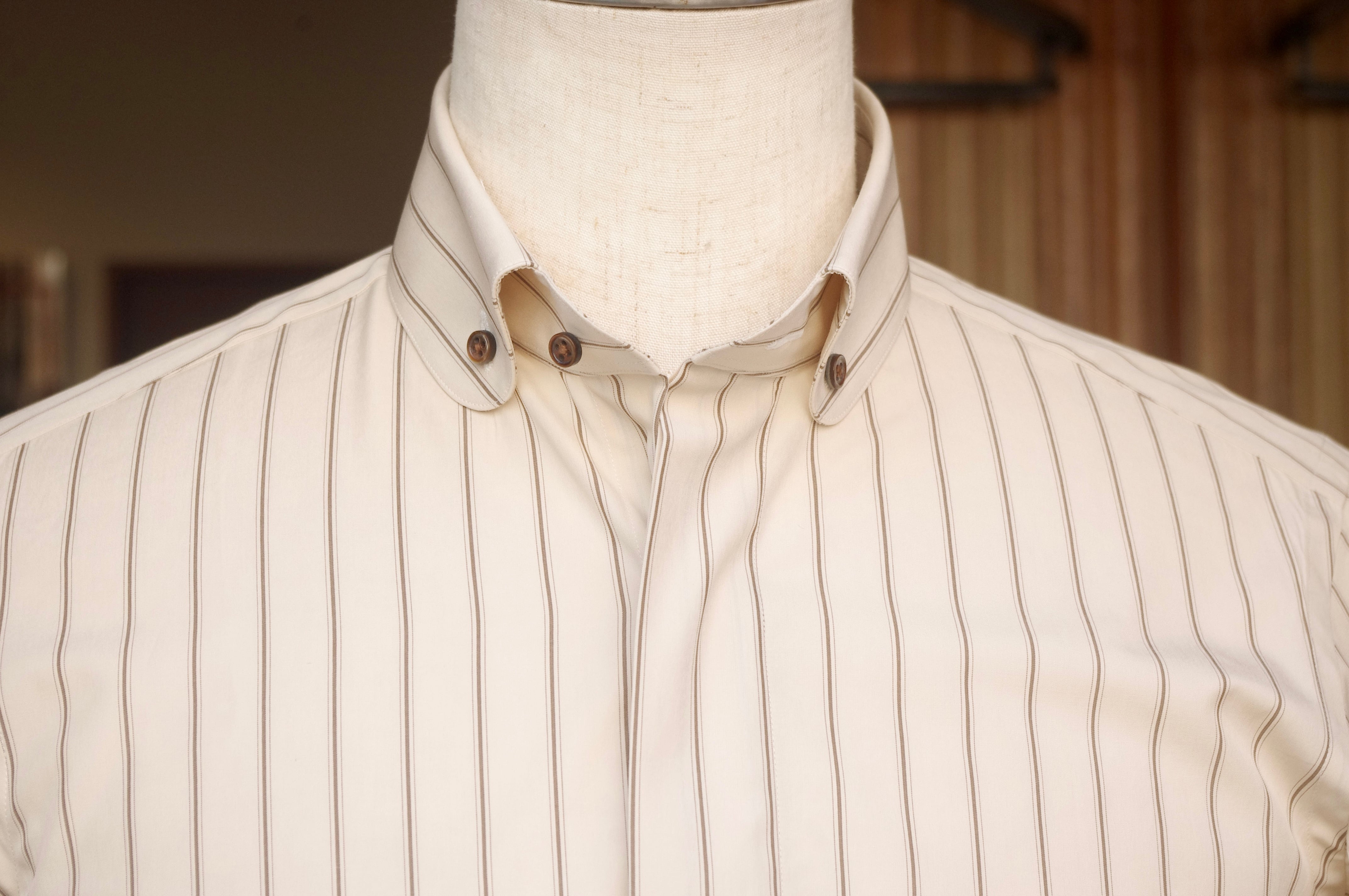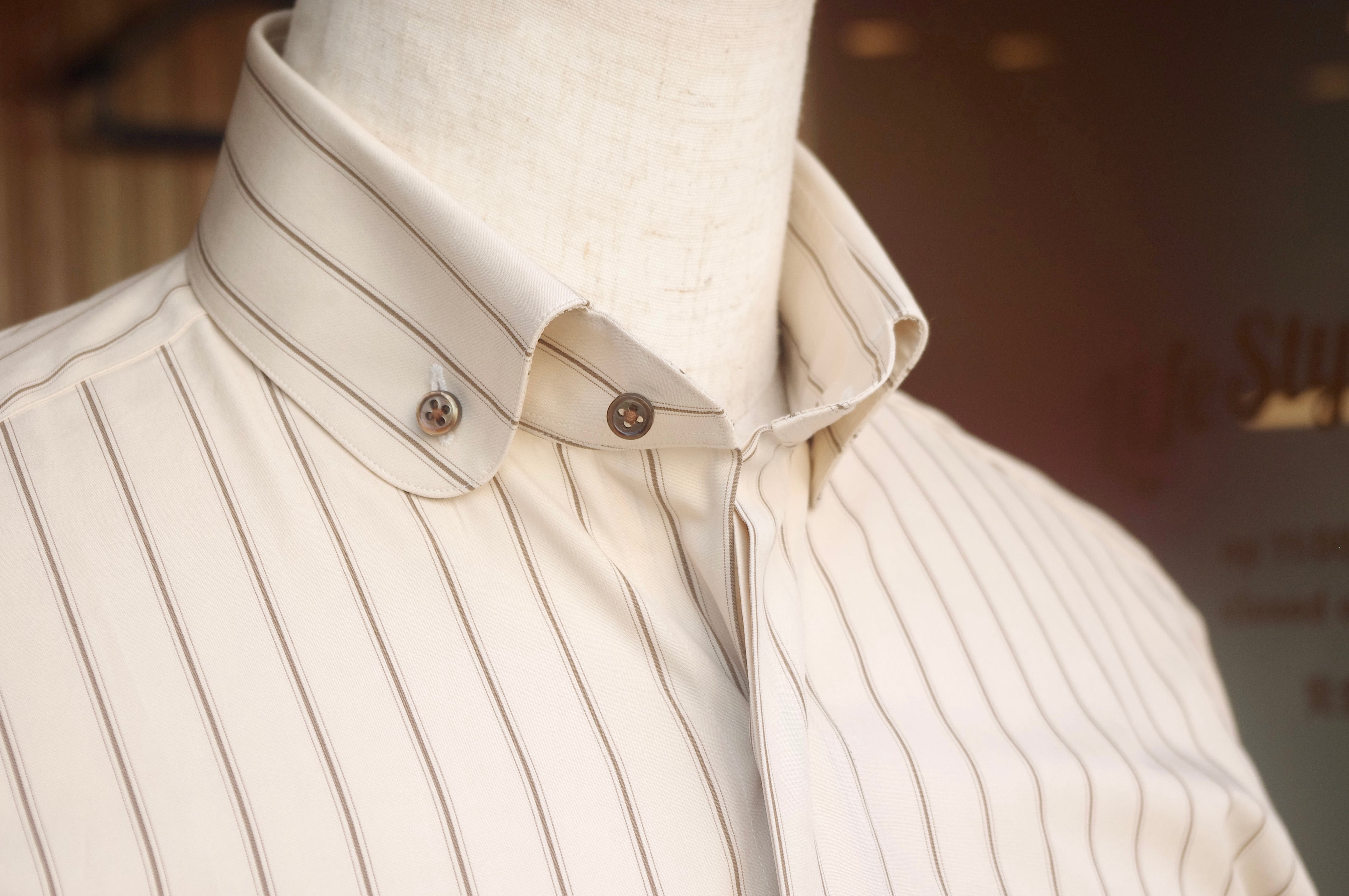 ラウンドカラーの襟先にボタンを付けたボタンダウン仕様。