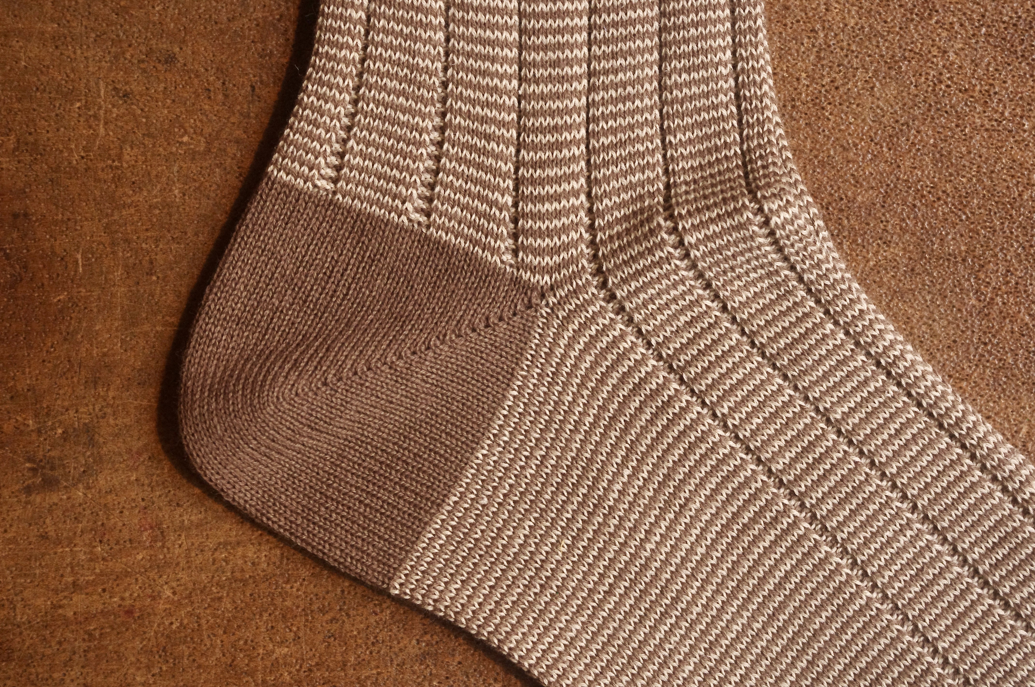 綿麻を使用した爽やかなワイドリブのピンボーダーソックスは、ミドルゲージではめずらしい希少なジャカード編機で丁寧に編み上げています。