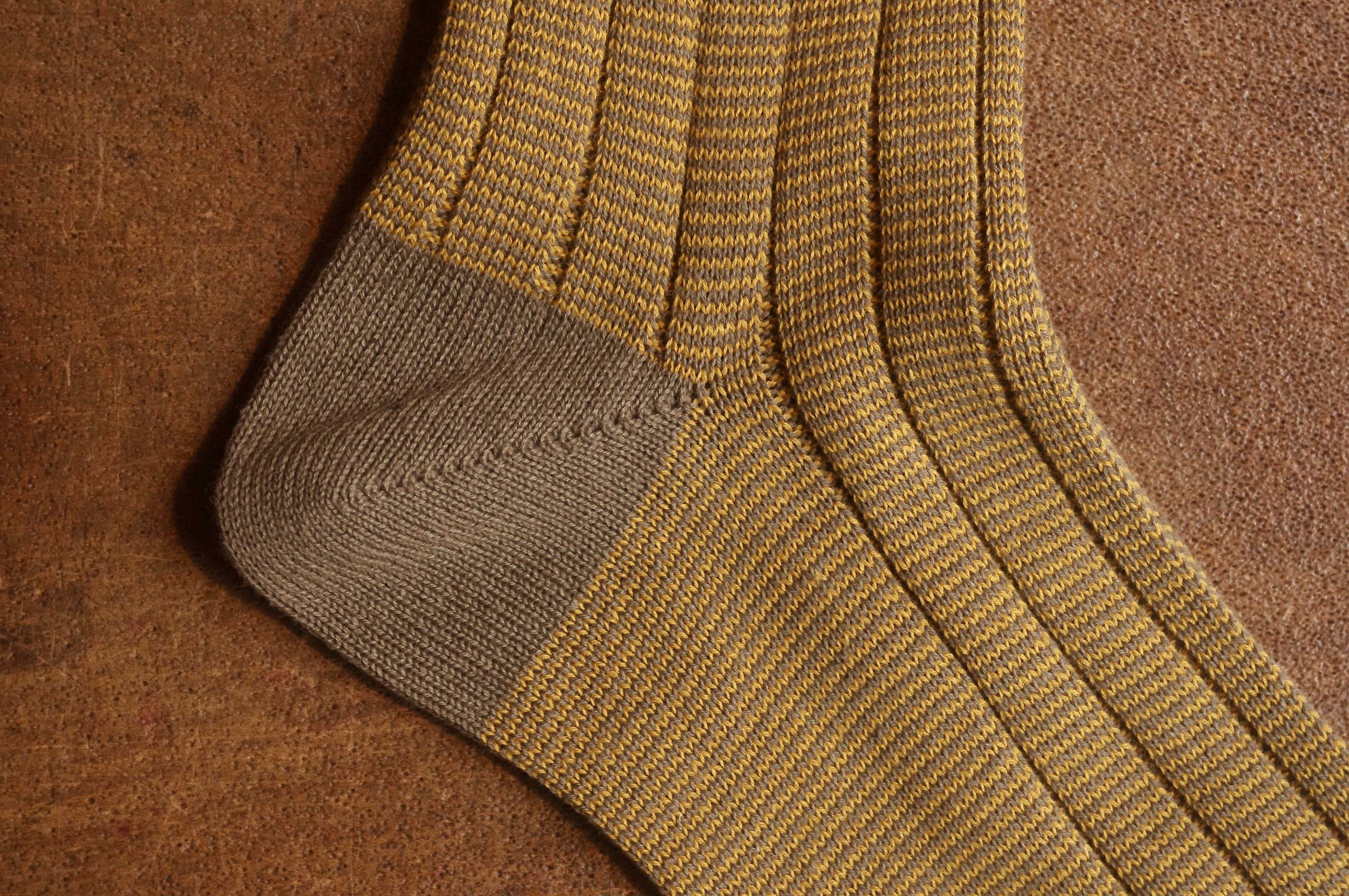 綿麻を使用した爽やかなワイドリブのピンボーダーソックスは、ミドルゲージではめずらしい希少なジャカード編機で丁寧に編み上げています。